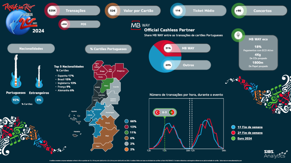 O MB WAY associou-se ao Rock in Rio Lisboa, como parceiro oficial de pagamentos cashless, e faz o balanço das transações na edição deste ano. 3 em cada 10 dos pagamentos com cartões nacionais foram feitos através da aplicação, tendo sido registadas 525 mil transações e movimentados mais de 6M €.