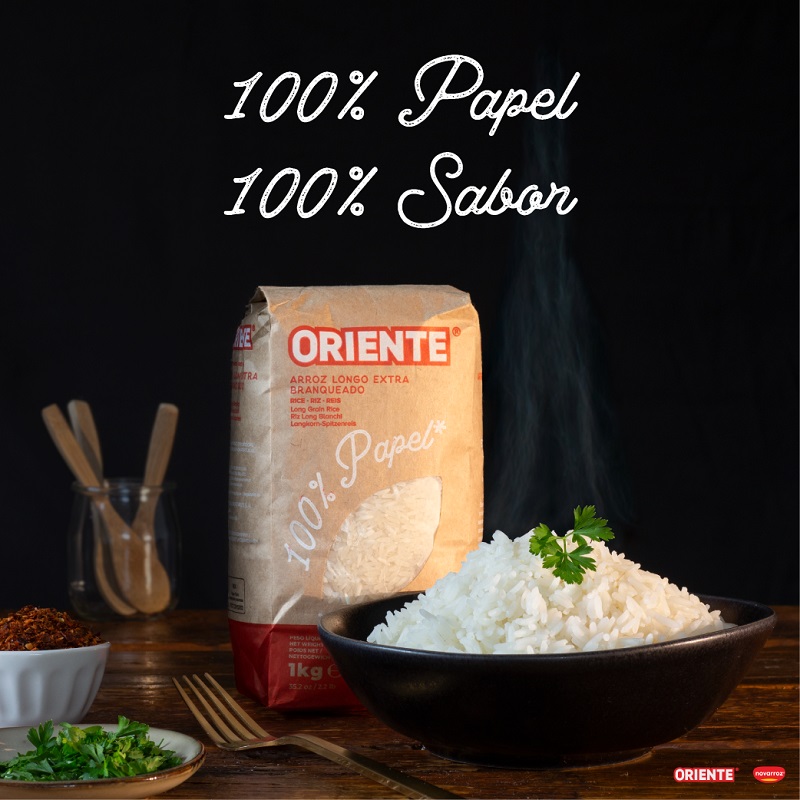 Com a sustentabilidade como eixo de quase toda a atividade produtiva, este arroz “Oriente” chega com “a primeira embalagem de arroz 100% em papel, incluindo também a janela de transparência em papel vegetal, feita a partir de papel proveniente de fontes responsáveis, 100% reciclável e biodegradável”.