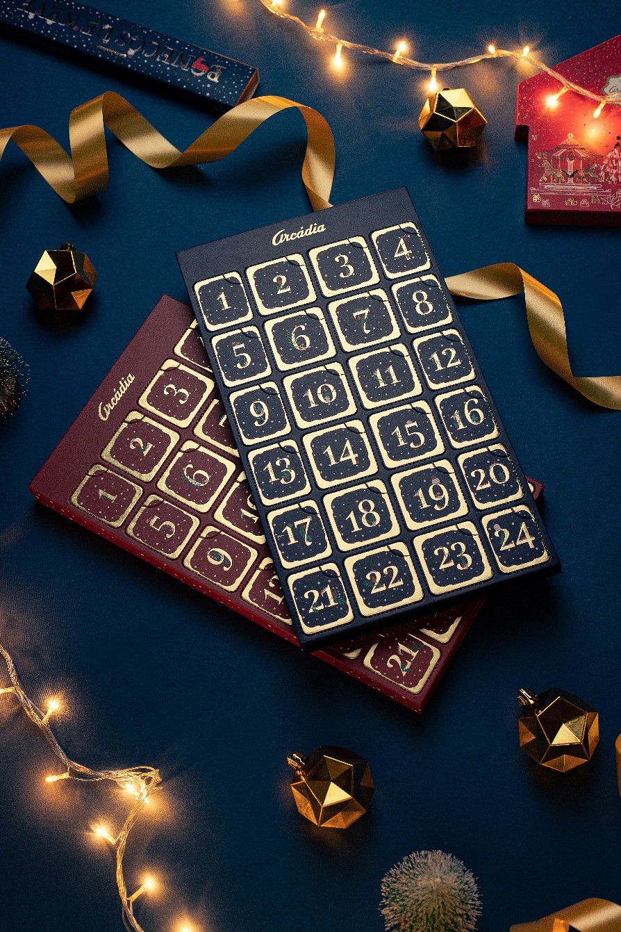 Calendário do Advento da Arcádia: a contagem decrescente mais doce do ano Uma janela por dia e a certeza de saborear um chocolate diferente até à noite mais mágica do ano. Com o Calendário do Advento da Arcádia conte os dias para o Natal com 24 bombons das melhores combinações de chocolate Arcádia. Em formato de Pinheiros, Estrelas, Pais Natais, Bonecos de Neve e Azevinhos, descubra o seu favorito. A adoçar o paladar dos portugueses há 90 anos, a marca de chocolates tem duas opções disponíveis do Calendário do Advento, uma de cor azul e outra de cor vermelha. Dois calendários onde pode encontrar bombons para todos os gostos: Chocolate de Leite, Chocolate Negro, Chocolate Branco e Ruby.