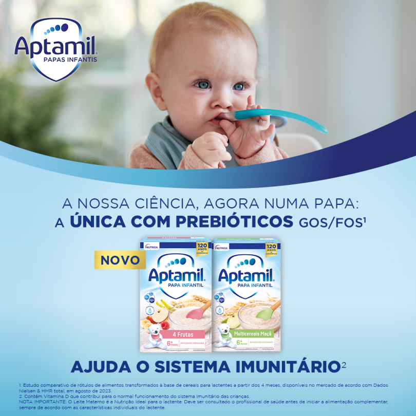 Nova gama de Papas Infantis Aptamil A Danone Nutricia, do grupo Danone, apresenta aos consumidores uma novidade nas prateleiras de alimentos infantis de todo o país, com o lançamento de APTAMIL Papas Infantis, que vêm assim reforçar o portfólio da marca com a entrada numa nova categoria, com três sabores, sem açúcares adicionados.