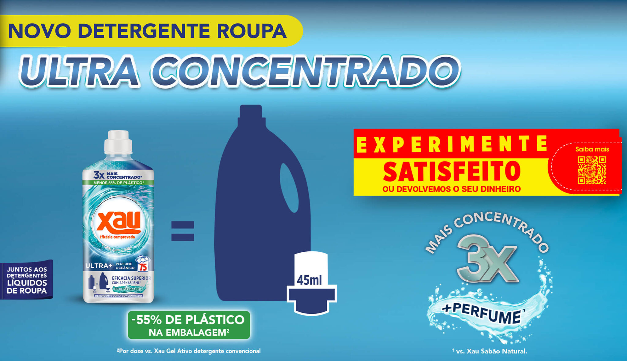Xau Ultra +: pequeno em tamanho, grande em performance A fórmula 3x mais concentrada de Xau Ultra + permite uma limpeza profunda mesmo a baixas temperaturas, revolucionando ao assegurar resultados perfeitos com apenas 15ml (menos de ½ tampa) *, o que se traduz numa significativa redução do impacto ambiental. Para incentivar os consumidores a experimentar o novo conceito e a comprovar esta eficácia, a marca lançou uma nova campanha de reembolso.