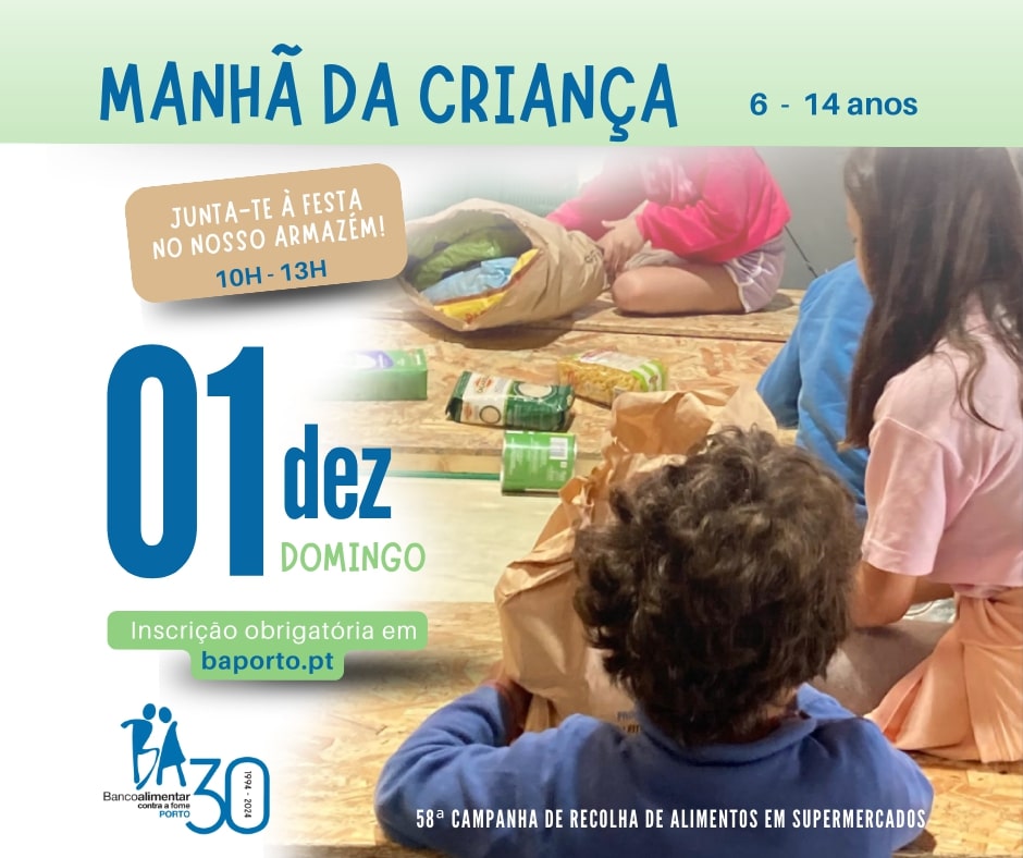 O Banco Alimentar Contra a Fome do Porto volta a dinamizar a Campanha de Recolha de Alimentos no próximo fim de semana, dias 30 de novembro e 1 de dezembro, com destaque para a manhã de domingo (1 de dezembro), em que vai decorre a já habitual “Manhã da Criança”. Esta iniciativa especial, que terá lugar nas instalações do Banco Alimentar do Porto, em Perafita, Matosinhos, entre as 10h00 e as 13h00, é dirigida a crianças dos 6 aos 14 anos. Durante este período, os mais jovens vão ter a oportunidade de participar em tarefas no armazém, contribuindo diretamente para esta causa solidária. O objetivo é despertar o espírito de voluntariado desde cedo, num ambiente pedagógico e inspirador.