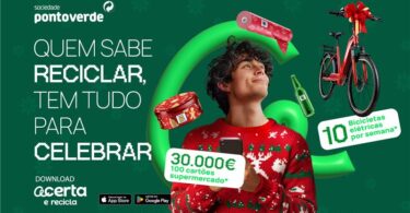 A app da Sociedade Ponto Verde (SPV), “Acerta e Recicla”, que ensina sobre reciclagem de embalagens, está de volta entre dia 29 de novembro, e o dia 26 de dezembro com várias novidades e associada a uma das efemérides mais especiais do ano: o Natal. Os utilizadores vão poder testar o seu conhecimento, participar em divertidos jogos e outras dinâmicas interativas, acumular pontos e habilitar-se a prémios. Hoje arranca a campanha de comunicação em TV, rádio, imprensa, outdoor e no digital. Agora sob o mote “Quem sabe reciclar, tem tudo para celebrar”, a “Acerta e Recicla” vai oferecer, a quem acumular mais pontos, prémios que somam mais de 30 mil euros. Serão atribuídos 100 cartões de supermercado: os 15 primeiros classificados ganham 500€ em cartão e os 85 classificados seguintes com melhor pontuação recebem 270€ em cartão. Os participantes podem, ainda, ganhar 40 bicicletas elétricas ao longo das quatro semanas de campanha, com 10 oferecidas por semana.