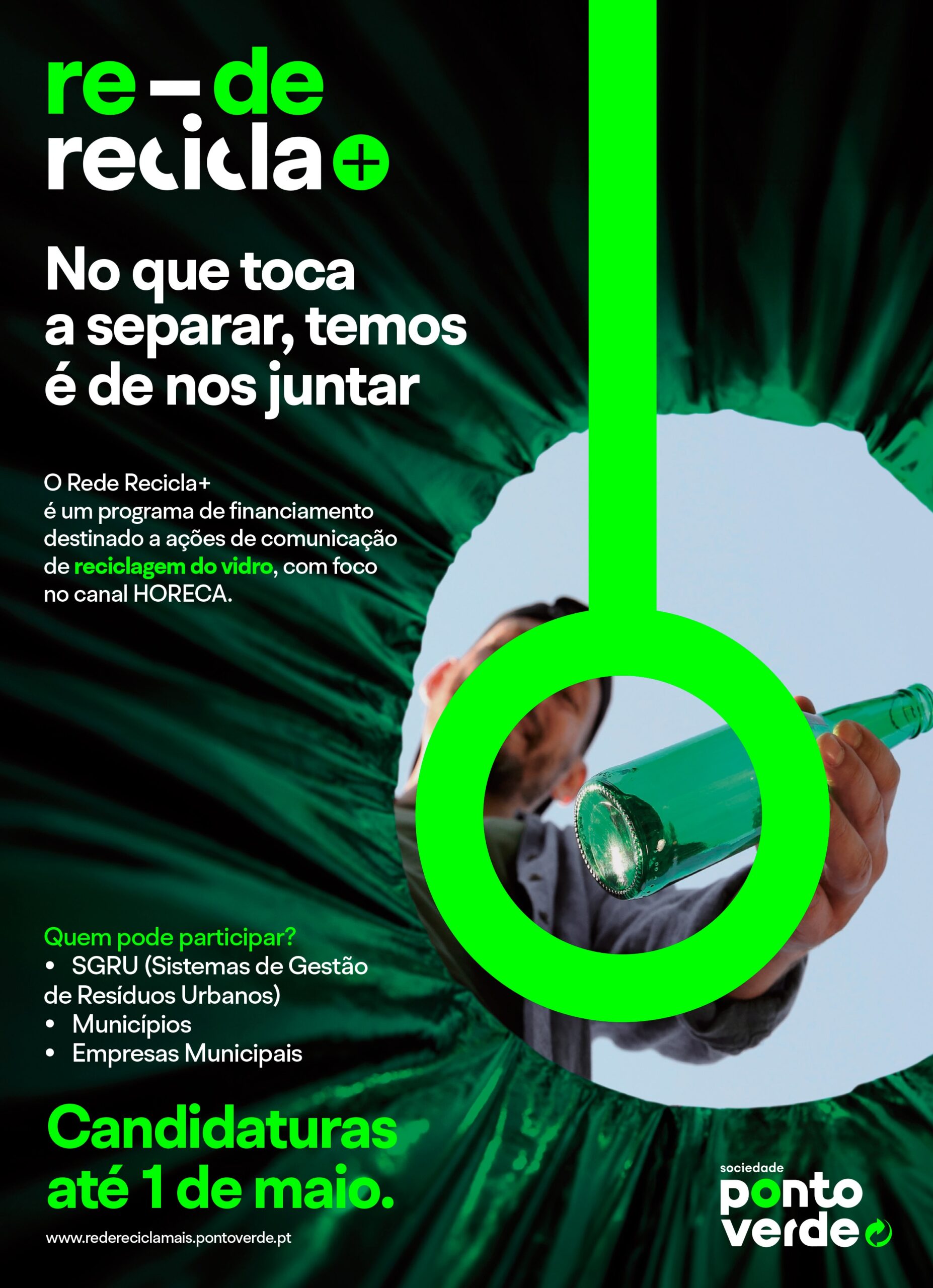 A Sociedade Ponto Verde (SPV) lança uma nova edição do programa de financiamento de ações de comunicação, sensibilização e educação para Sistemas Integrados de Gestão de Resíduos Urbanos (SGRU), Municípios e Empresas Municipais, agora designado “Rede Recicla+”. Além de promover o bom funcionamento do Sistema Integrado de Gestão de Resíduos de Embalagem (SIGRE), esta iniciativa visa fomentar o trabalho colaborativo, garantindo a cooperação e implementação de ações locais de comunicação e sensibilização em parceria com estas entidades. As candidaturas podem ser submetidas até ao próximo dia 1 de maio.