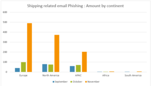 Na Europa, o aumento foi de 401% em comparação com o mês de outubro, sendo a DHL a marca mais imitada, compondo 77% dos ataques.
