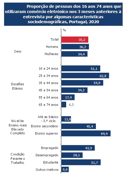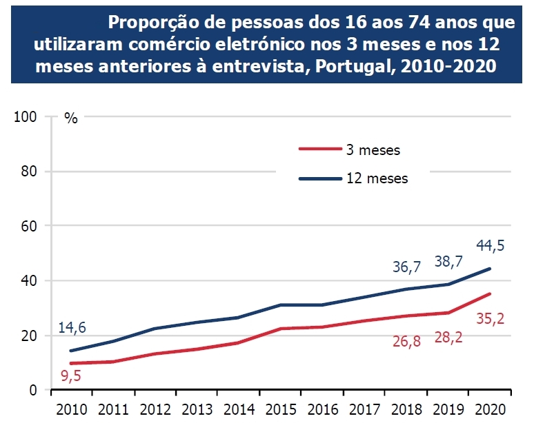 Esta maior ligação dos agregados familiares à internet fez com que, neste período de pandemia, a percentagem de utilizadores de comércio eletrónico registasse, em 2020, o maior aumento da série iniciada em 2002, mais 7 p.p. que em 2019. Em 2020, 44,5% das pessoas dos 16 aos 74 anos efetuaram encomendas pela internet nos 12 meses anteriores à realização do inquérito e 35,2% nos 3 meses anteriores.