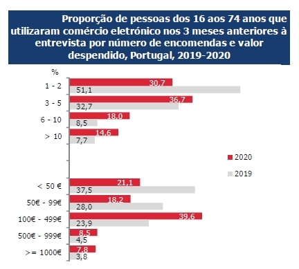 Em 2020, aumentou significativamente a quantidade de encomendas efetuadas pelos utilizadores de comércio eletrónico, com os números a indicarem que aumentou em 9,5 p.p. a expressão relativa do grupo dos que fizeram entre 6 a 10 encomendas, em 6,9 p.p. dos que fizeram mais de 10 encomendas e 4 p.p. dos que fizeram 3 a 5 encomendas.
