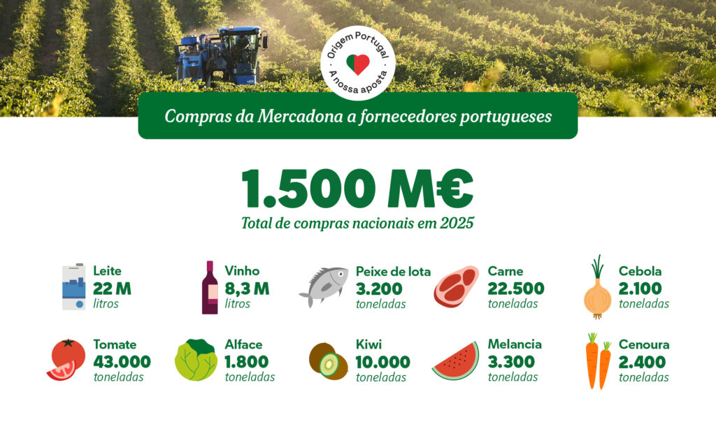 A Mercadona realizou 1.500 milhões de euros em compras a fornecedores portugueses em 2025, reforçando o peso do abastecimento nacional na sua operação em Portugal, onde conta atualmente com mais de 70 lojas.