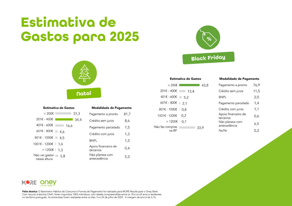 O Barómetro “Hábitos de Consumo e Formas de Pagamento” foi realizado pela MORE Results para o Oney Bank. O estudo recorreu à metodologia CAWI (Computer Assisted Web Interviewing) e contou com uma amostra de 1.003 indivíduos, com idades entre os 18 e os 65 anos, residentes em Portugal.
