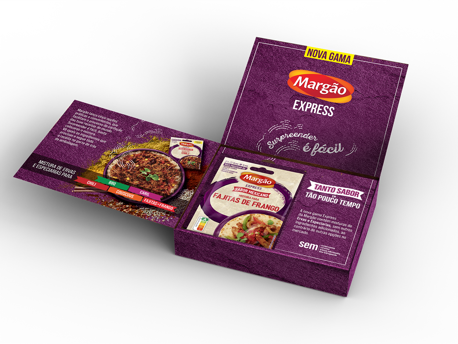 Margão lança Express, uma gama dedicada a receitas famosas internacionais A Margão, marca líder no segmento das Especiarias e Ervas Aromáticas, acaba de lançar a gama Express, com o objetivo de inspirar os consumidores a recriarem, com simplicidade, receitas típicas de várias partes do mundo, diversificando o seu leque de opções culinárias no dia-a-dia. Sem corantes, conservantes, aromas adicionados, ou óleo hidrogenado, a gama Express conta com 5 referências, cada uma correspondente a uma receita específica: Sabor Indiano | Mistura para Caril, Sabor Mexicano | Mistura para Chili, Sabor Marroquino | Mistura para Couscous, Sabor Mexicano | Mistura para Fajitas de Frango, Sabor Mediterrâneo | Mistura para BBQ.