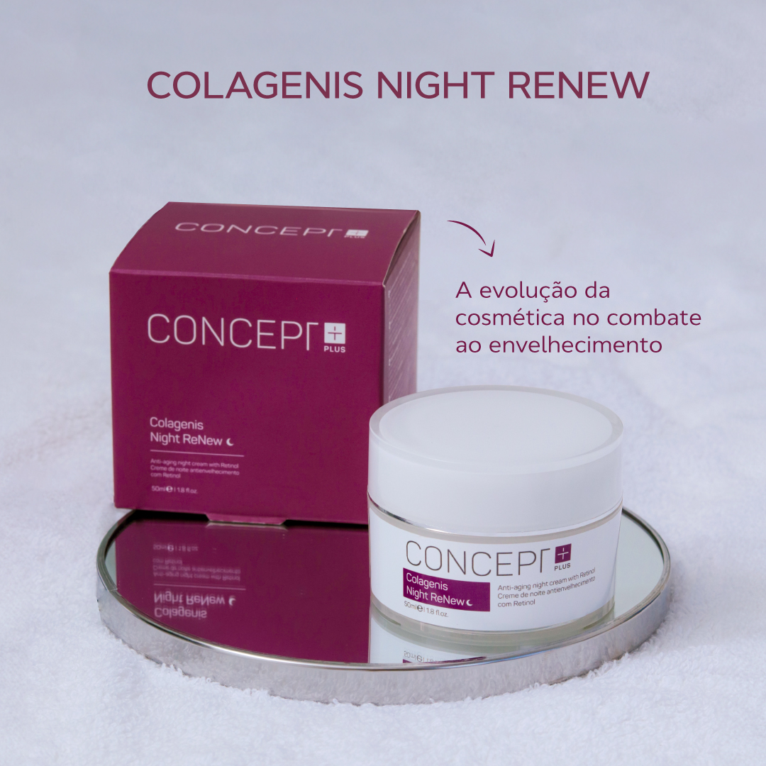 Concept+ lança Colagenis Night ReNew A Concept+, marca de produtos de corpo e rosto do GrupoConcept, acaba de lançar o seu mais recente produto, o novo Colagenis Night ReNew que desafia a completar a rotina de cuidados de pele antienvelhecimento. Numa combinação de vários ativos antienvelhecimento como o retinol encapsulado e o ácido hialurónico, o novo creme de noite da Concept+ acelera o processo de renovação da pele e estimula a produção de colagénio, ácido hialurónico e elastina, reduzindo as rugas profundas e melhorando a firmeza da pele.