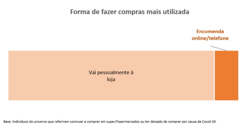 Entre os inquiridos que diminuíram a frequência ou deixaram de ir a super/hipermercados (69,8%), cerca de 38% afirmam que passaram a ir a outro tipo de lojas (maioritariamente ao comércio local: minimercados, mercearias, talhos, peixarias, padarias, etc.), enquanto 62,0% referem que os locais de compras se mantêm.