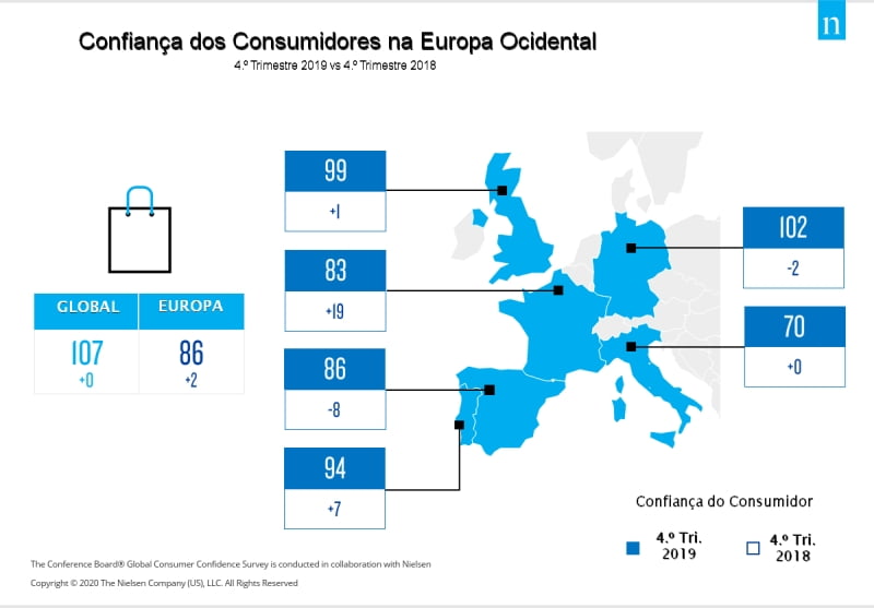 No último trimestre de 2019, os portugueses voltaram a mostrar-se mais confiantes do que os consumidores a nível europeu. De acordo com os resultados do estudo “The Conference Board – Global Consumer Confidence Survey”, conduzido em colaboração com a Nielsen, o grau de confiança registado entre os consumidores portugueses, no quatro trimestre de 2019, manteve, com os 94 pontos já conseguidos neste Índice nos dois trimestres anteriores, o mais alto de sempre no nosso país.