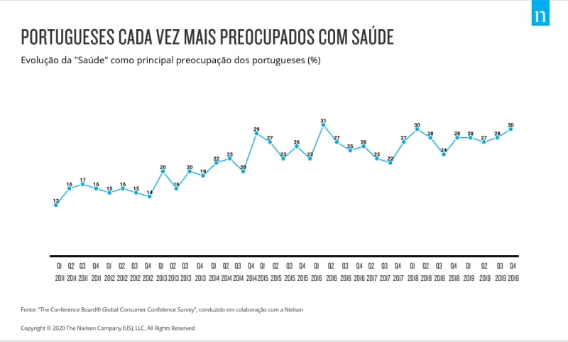 A saúde tem vindo a ganhar cada vez mais importância nos últimos anos e consolidou a sua posição como a principal preocupação dos portugueses (30%). Portugal é agora o país da Europa Ocidental que revela maior preocupação com este tema, apenas precedido pela Finlândia (32%). Esta preocupação tem um claro impacto nas tendências de consumo, observando-se dinamismo e bom desempenho de todas as categorias e inovações relacionadas com a saúde.