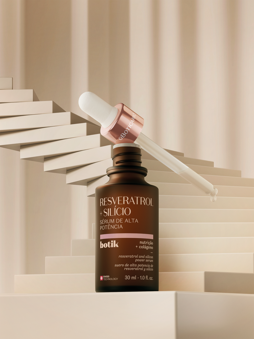 Botik lança linha inovadora de cuidados faciais com Resveratrol e Silício O Boticário apresenta a nova linha Botik Resveratrol + Silício, uma linha de cuidados faciais de alta performance, co-criada com médicos experientes, que minimiza os efeitos causados na pele pelo desequilíbrio hormonal que acontece durante a perimenopausa e a menopausa. Com o objetivo de proporcionar uma rotina de cuidados completa e eficaz, com resultados visíveis e comprovados, a linha combina ingredientes de alta potência como o Resveratrol e o Silício que, juntos, potencializam o colagénio, melhoram a firmeza da pele, minimizam a visibilidade de rugas acentuadas e devolvem a luminosidade da pele.