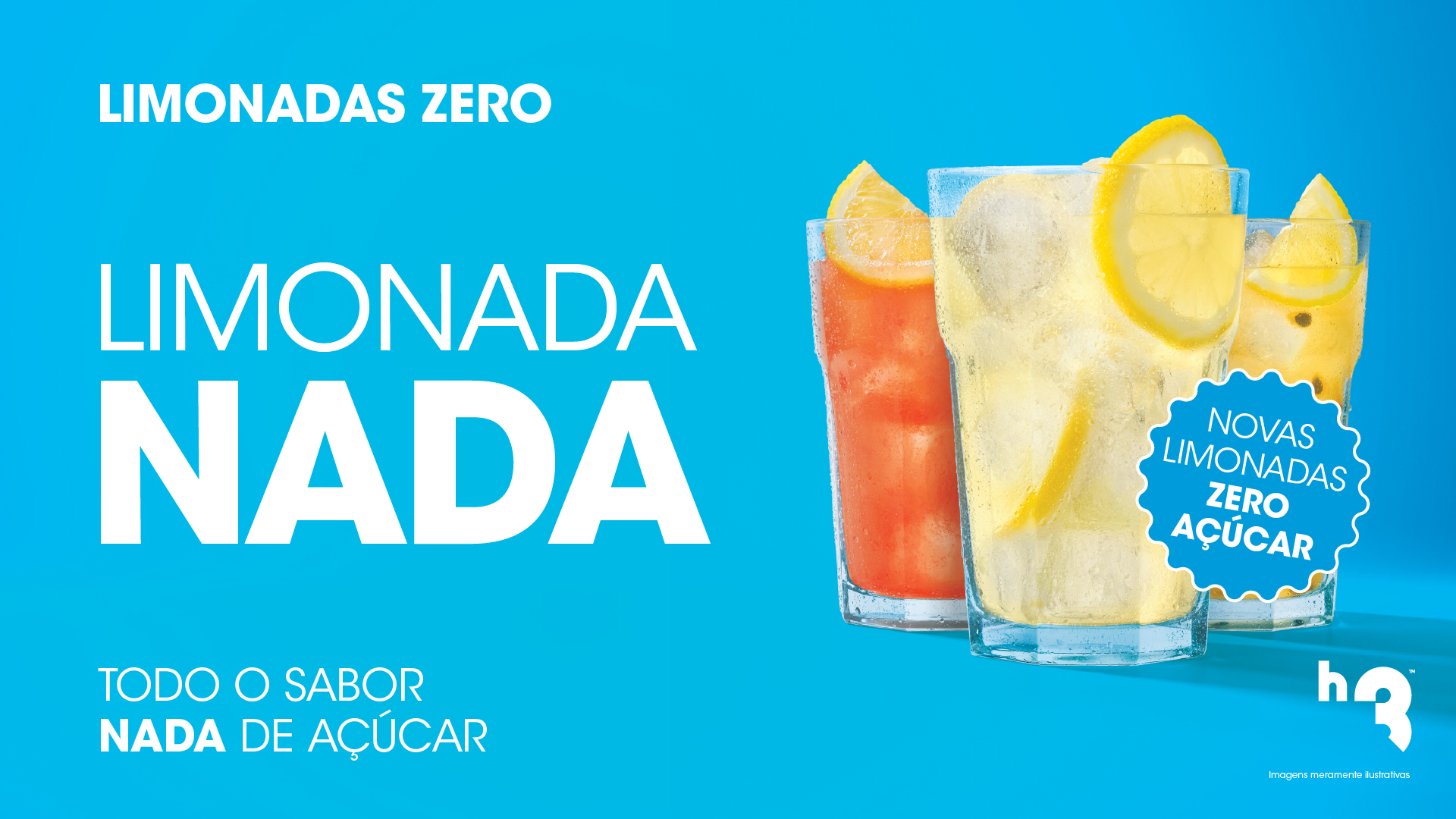 H3 lança limonada zero Todo o Sabor, Nada de Açúcar. A nova categoria de limonadas do h3 é diferente… em nada. Nada temam. As limonadas clássicas de limão, morango e maracujá vão continuar disponíveis em todas as lojas. Todo o sabor, mas agora também na versão zero açúcar: mantém o sabor que já conquistou os clientes e é adoçada com stevia, juntando-se à oferta existente: com açúcar, sem açúcar e meio/meio. Com este lançamento, o h3 reforça a aposta em oferecer mais opções a todos os clientes, incentivando à experimentação sem comprometer o sabor de uma das bebidas mais pedidas nos restaurantes da marca do grupo Real Food.