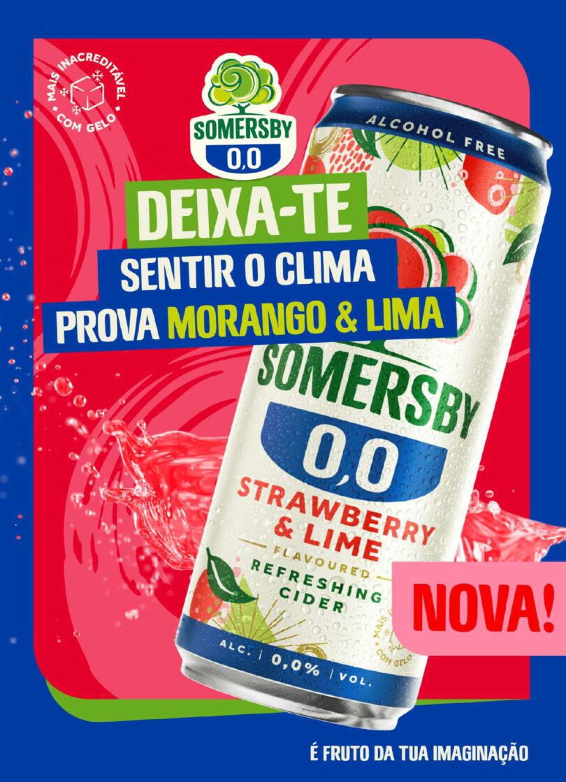 Somersby Morango & Lima: o novo sabor do verão chegou em modo 0.0% Somersby acaba de anunciar a chegada do reforço mais esperado para os dias de sol: a nova Somersby Morango & Lima 0.0%. A única marca de sidras sem álcool do mercado português reforça assim este segmento, oferecendo uma alternativa refrescante e cheia de sabor para todos os momentos de convívio, sem qualquer restrição. A nova Somersby Morango & Lima 0.0% é uma harmonia leve e vibrante, combinando o doce do morango com um toque cítrico e refrescante de lima. O resultado é uma frescura que desperta os sentidos e que prova ser possível ter toda a atitude e o espírito irreverente de uma Somersby sem álcool.