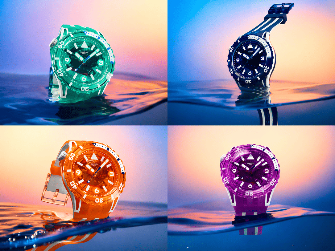 Coleção Swatch SCUBAQUA acolhe quatro novos modelos que mudam a maré A Swatch volta a criar ondas com a sua Coleção Swatch SCUBAQUA, que surge agora com quatro novas cores: verde-água, azul meia-noite, fúcsia elétrico e laranja solar. Numa nova evolução da coleção, os modelos verde-água e azul meia-noite estão equipados com Swatch Pay*, permitindo aos utilizadores efetuar pagamentos seguros sem contacto diretamente a partir do pulso. É uma atualização prática e discreta que acrescenta conveniência diária ao espírito divertido da coleção. Inspirados no mundo hipnotizante das medusas e concebidos para aventuras acima e abaixo da superfície no mar, estes relógios de mergulho combinam as suas divertidas cores com caixas criadas a partir da fusão de Bioceramic e materiais de origem biológica.